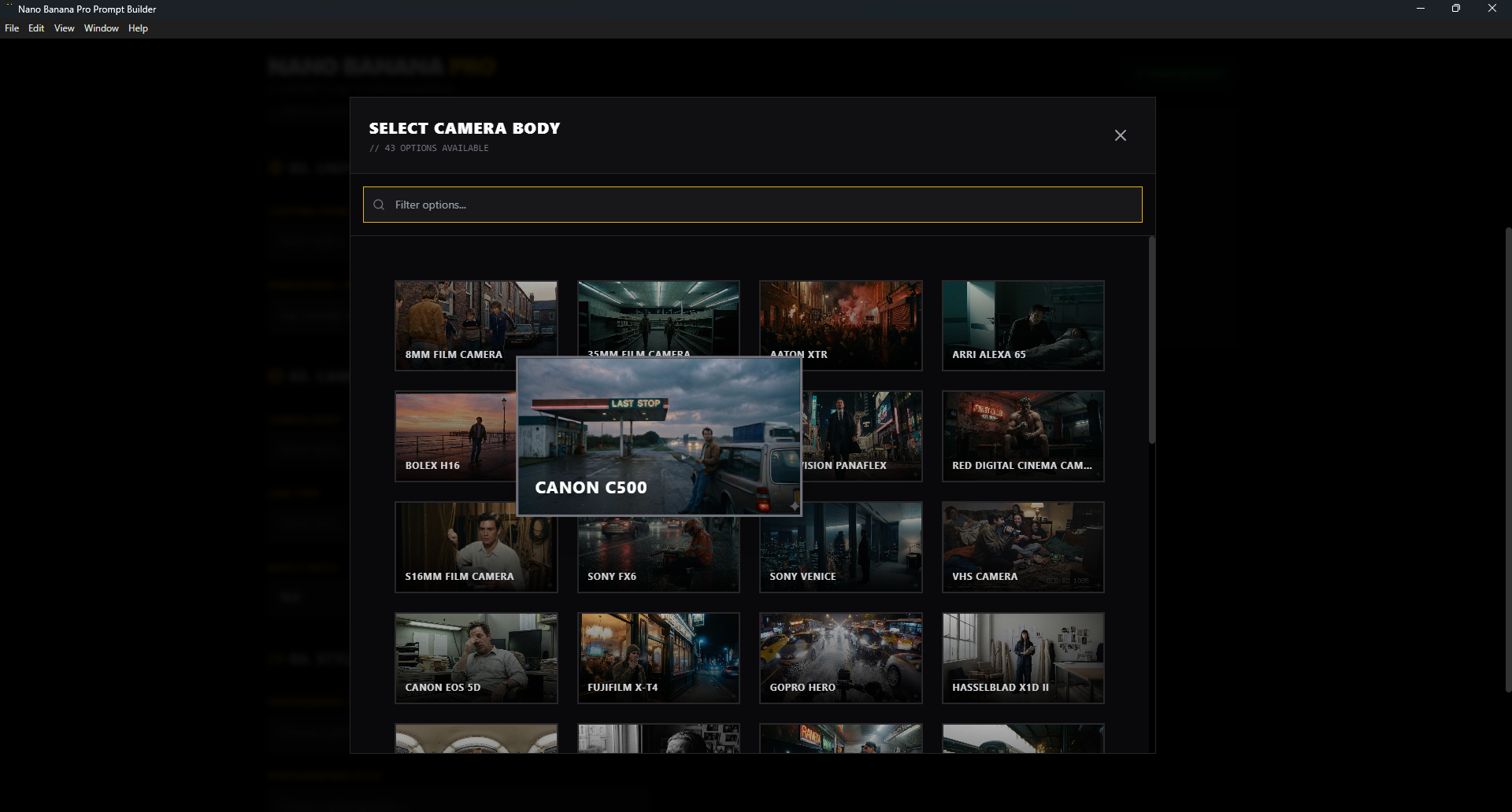 - Camera Gear: Select specific bodies (e.g., Panavision Panaflex) and lens types.